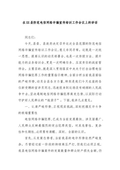 / 【七哥公文】2025年:在XX县防范电信网络诈骗宣传培训工作会议上的讲话+更多免费公文+VX:QiGeGongWen2024