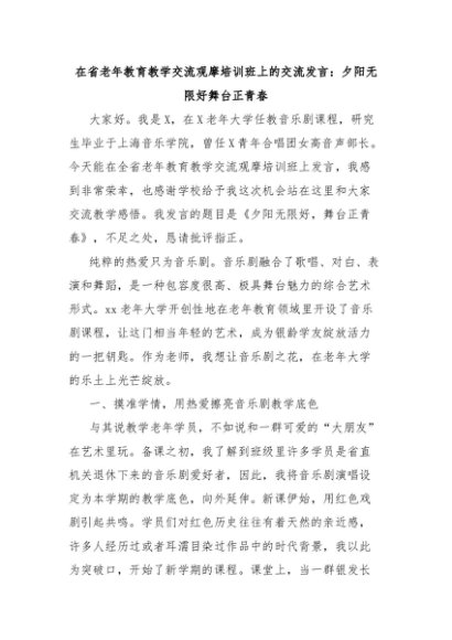 【七哥公文】2025年:在省老年教育教学交流观摩培训班上的交流发言:夕阳无限好舞台正青春+更多免费公文+VX:QiGeGongWen2024