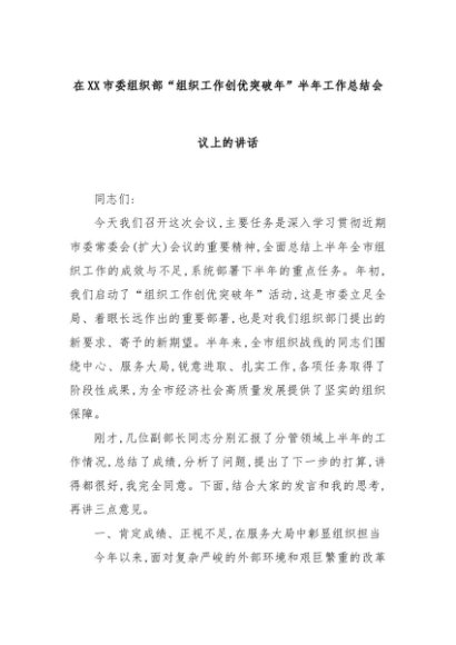 【七哥公文】2025年:在XX市委组织部“组织工作创优突破年”半年工作总结会议上的讲话+更多免费公文+VX:QiGeGongWen2024