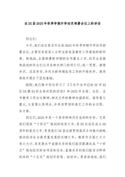 【七哥公文】2025年:在XX县2025年秋季学期开学动员部署会议上的讲话+更多免费公文+VX:QiGeGongWen2024