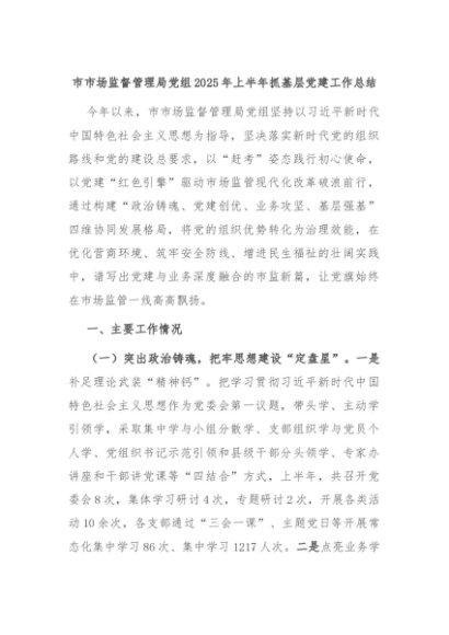 【七哥公文】2025年:市市场监督管理局党组2025年上半年抓基层党建工作总结+更多免费公文+VX:QiGeGongWen2024
