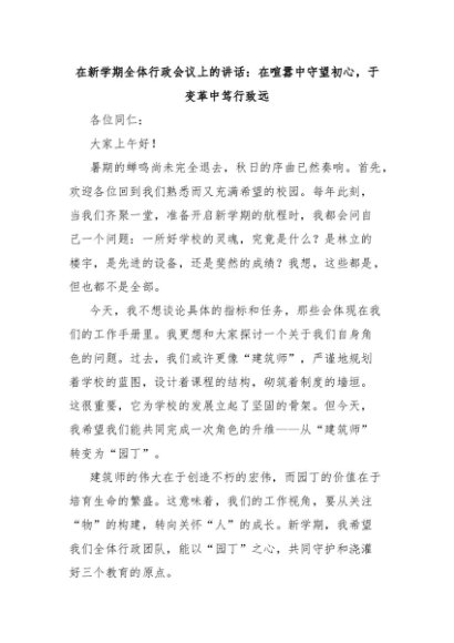 【七哥公文】2025年:在新学期全体行政会议上的讲话:在喧嚣中守望初心,于变革中笃行致远+更多免费公文+VX:QiGeGongWen2024