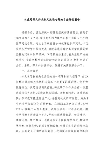 / 【七哥公文】2025年:林业局深入开展作风建设专题的自查评估报告+更多免费公文+VX:QiGeGongWen2024