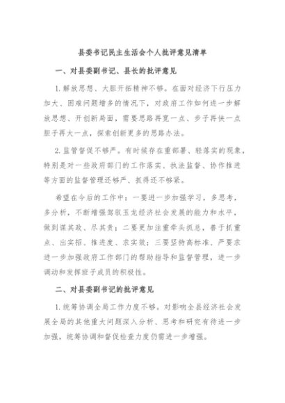 【七哥公文】2025年:县委书记民主生活会个人批评意见清单+更多免费公文+VX:QiGeGongWen2024