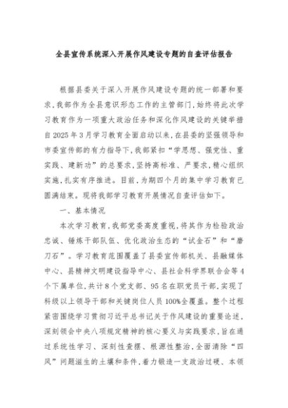 / 【七哥公文】2025年:全县宣传系统深入开展作风建设专题的自查评估报告+更多免费公文+VX:QiGeGongWen2024