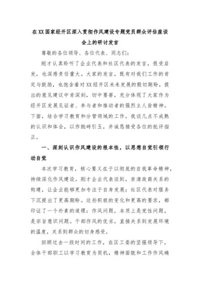 【七哥公文】2025年:在XX国家经开区深入贯彻作风建设专题党员群众评估座谈会上的研讨发言+更多免费公文+VX:QiGeGongWen2024