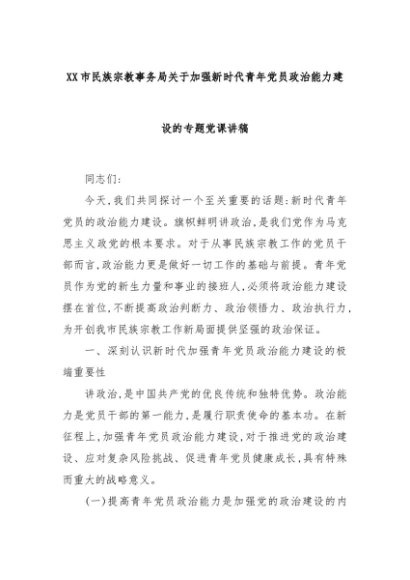 【七哥公文】2025年:XX市民族宗教事务局关于加强新时代青年党员政治能力建设的专题党课讲稿+更多免费公文+VX:QiGeGongWen2024