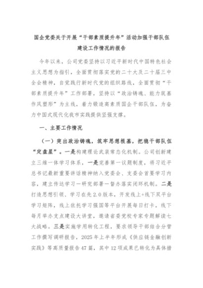 【七哥公文】2025年:国企党委关于开展“干部素质提升年”活动加强干部队伍建设工作情况的报告+更多免费公文+VX:QiGeGongWen2024