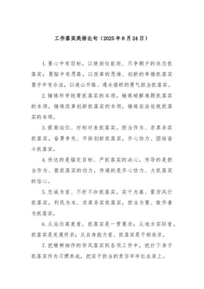 / 【七哥公文】2025年:工作落实类排比句(2025年8月24日)+更多免费公文+VX:QiGeGongWen2024