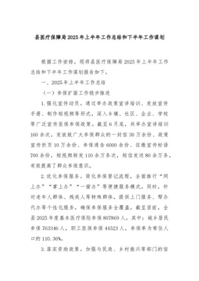 【七哥公文】2025年:县医疗保障局2025年上半年工作总结和下半年工作谋划+更多免费公文+VX:QiGeGongWen2024