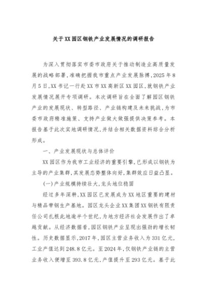【七哥公文】2025年:关于XX园区钢铁产业发展情况的调研报告+更多免费公文+VX:QiGeGongWen2024