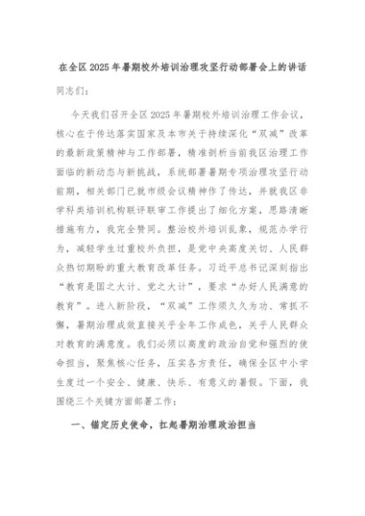 【七哥公文】2025年:在全区2025年暑期校外培训治理攻坚行动部署会上的讲话+更多免费公文+VX:QiGeGongWen2024