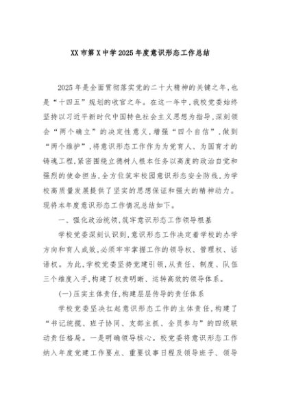 / 【七哥公文】2025年:XX市第X中学2025年度意识形态工作总结+更多免费公文+VX:QiGeGongWen2024