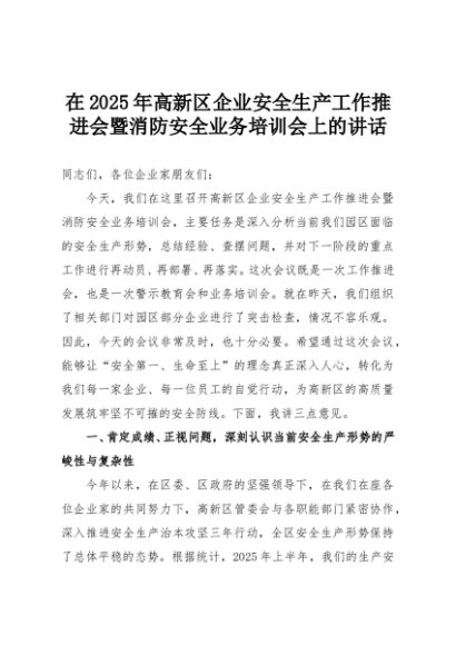 【七哥公文】2025年:在2025年高新区企业安全生产工作推进会暨消防安全业务培训会上的讲话+更多免费公文+VX:QiGeGongWen2024