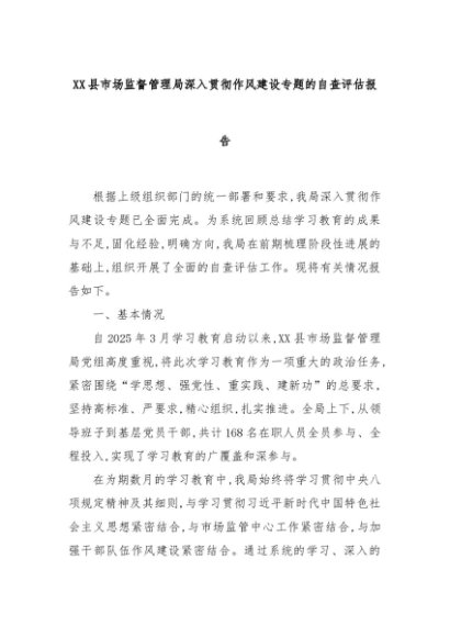 【七哥公文】2025年:XX县市场监督管理局深入贯彻作风建设专题的自查评估报告+更多免费公文+VX:QiGeGongWen2024