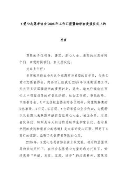 【七哥公文】2025年:X爱心志愿者协会2025年工作汇报暨助学金发放仪式上的发言+更多免费公文+VX:QiGeGongWen2024