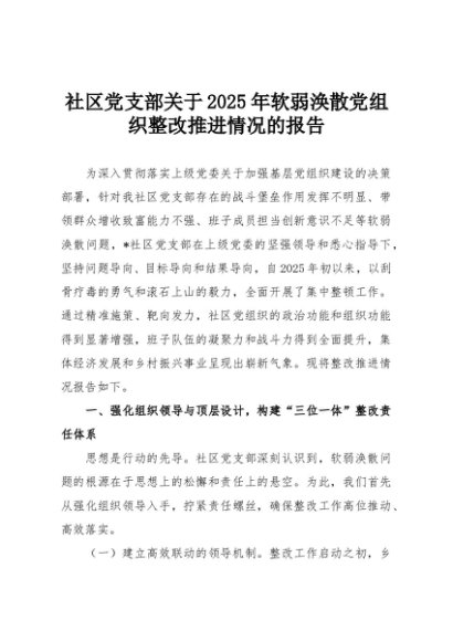 【七哥公文】2025年:社区党支部关于2025年软弱涣散党组织整改推进情况的报告+更多免费公文+VX:QiGeGongWen2024