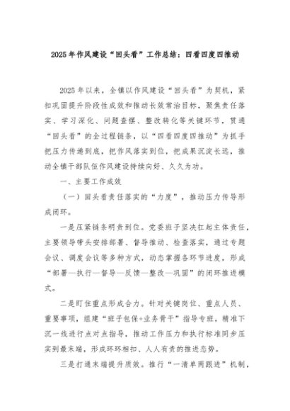【七哥公文】2025年:2025年作风建设“回头看”工作总结:四看四度四推动+更多免费公文+VX:QiGeGongWen2024