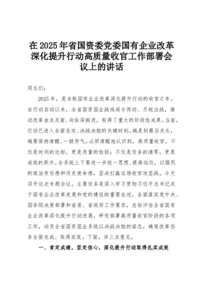 【七哥公文】2025年:在2025年省国资委党委国有企业改革深化提升行动高质量收官工作部署会议上的讲话+更多免费公文+VX:QiGeGongWen2024