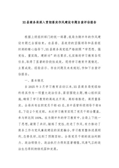 / 【七哥公文】2025年:XX县商务局深入贯彻落实作风建设专题自查评估报告+更多免费公文+VX:QiGeGongWen2024