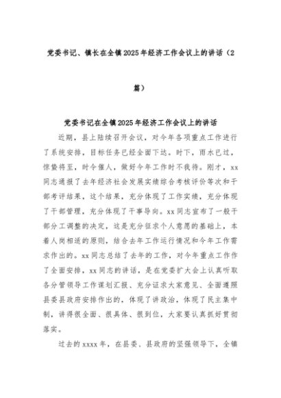【七哥公文】2025年:(2篇)党委书记、镇长在全镇2025年经济工作会议上的讲话+更多免费公文+VX:QiGeGongWen2024