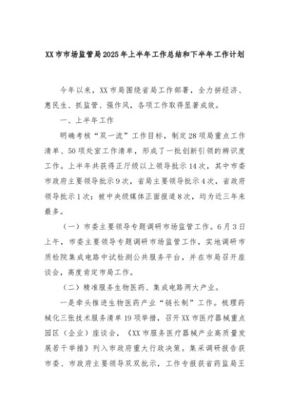 【七哥公文】2025年:XX市市场监管局2025年上半年工作总结和下半年工作计划+更多免费公文+VX:QiGeGongWen2024