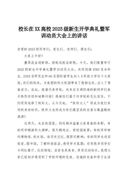 【七哥公文】2025年:校长在XX高校2025级新生开学典礼暨军训动员大会上的讲话+更多免费公文+VX:QiGeGongWen2024