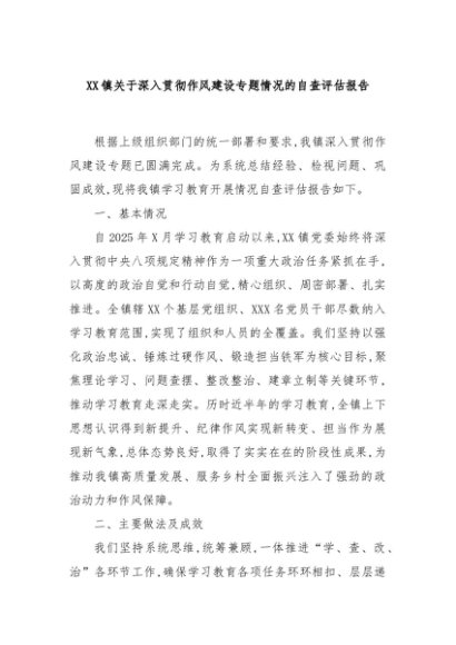 / 【七哥公文】2025年:XX镇关于深入贯彻作风建设专题情况的自查评估报告+更多免费公文+VX:QiGeGongWen2024