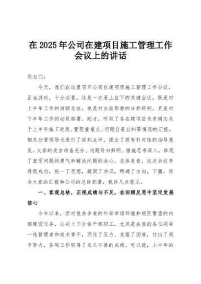 / 【七哥公文】2025年:在2025年公司在建项目施工管理工作会议上的讲话+更多免费公文+VX:QiGeGongWen2024