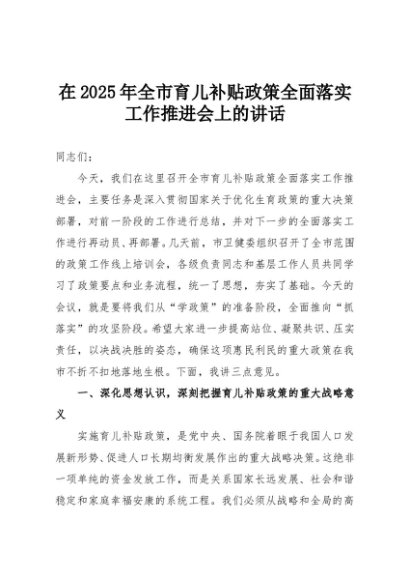 【七哥公文】2025年:在2025年全市育儿补贴政策全面落实工作推进会上的讲话+更多免费公文+VX:QiGeGongWen2024
