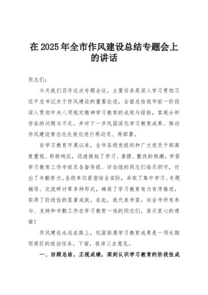 / 【七哥公文】2025年:在2025年全市作风建设总结专题会上的讲话+更多免费公文+VX:QiGeGongWen2024