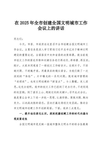 / 【七哥公文】2025年:在2025年全市创建全国文明城市工作会议上的讲话+更多免费公文+VX:QiGeGongWen2024