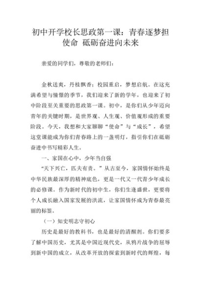 【七哥公文】2025年:初中开学校长思政第一课:青春逐梦担使命 砥砺奋进向未来+更多免费公文+VX:QiGeGongWen2024
