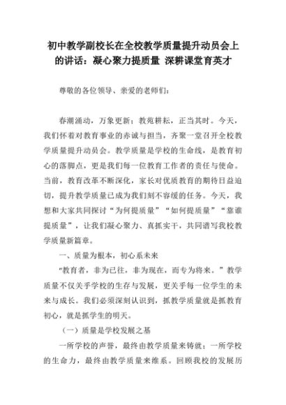 【七哥公文】2025年:初中教学副校长在全校教学质量提升动员会上的讲话:凝心聚力提质量 深耕课堂育英才+更多免费公文+VX:QiGeGongWen2024