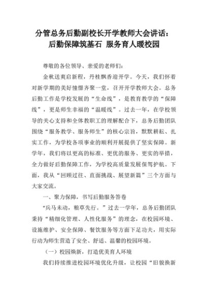 【七哥公文】2025年:分管总务后勤副校长开学教师大会讲话:后勤保障筑基石 服务育人暖校园+更多免费公文+VX:QiGeGongWen2024