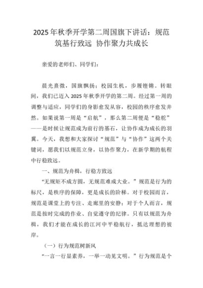 【七哥公文】2025年:2025年秋季开学第二周国旗下讲话:规范筑基行致远 协作聚力共成长+更多免费公文+VX:QiGeGongWen2024