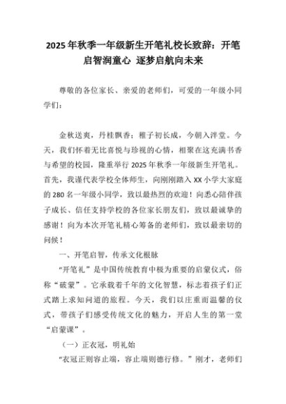 【七哥公文】2025年:2025年秋季一年级新生开笔礼校长致辞:开笔启智润童心 逐梦启航向未来+更多免费公文+VX:QiGeGongWen2024