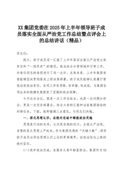 【七哥公文】2025年:XX集团党委在2025年上半年领导班子成员落实全面从严治党工作总结暨点评会上的总结讲话(精品)+更多免费公文+VX:QiGeGongWen2024