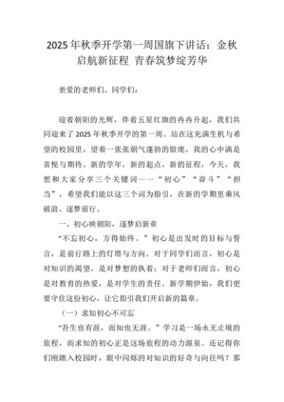 【七哥公文】2025年:2025年秋季开学第一周国旗下讲话:金秋启航新征程 青春筑梦绽芳华+更多免费公文+VX:QiGeGongWen2024