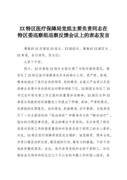 【七哥公文】2025年:XX特区医疗保障局党组主要负责同志在特区委巡察组巡察反馈会议上的表态发言+更多免费公文+VX:QiGeGongWen2024