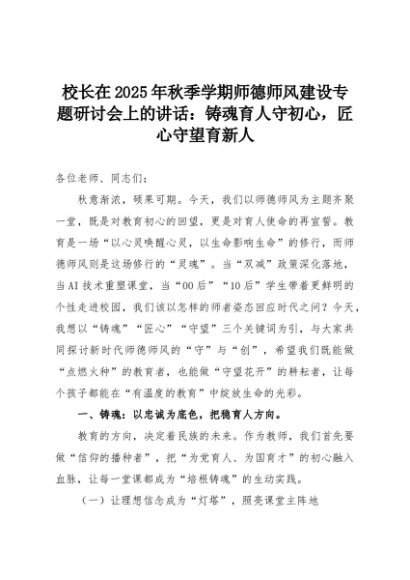 【七哥公文】2025年:校长在2025年秋季学期师德师风建设专题研讨会上的讲话:铸魂育人守初心,匠心守望育新人+更多免费公文+VX:QiGeGongWen2024