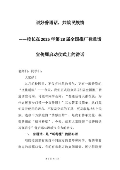 【七哥公文】2025年:校长在2025年第28届全国推广普通话宣传周启动仪式上的讲话:说好普通话,共筑民族情+更多免费公文+VX:QiGeGongWen2024