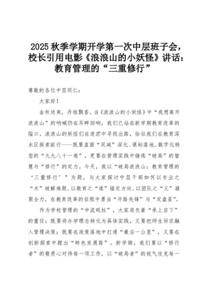 【七哥公文】2025年:2025秋季学期开学第一次中层班子会,校长引用电影《浪浪山的小妖怪》讲话:教育管理的“三重修行”+更多免费公文+VX:QiGeGongWen2024