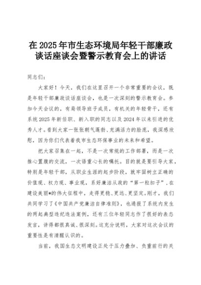 【七哥公文】2025年:在2025年市生态环境局年轻干部廉政谈话座谈会暨警示教育会上的讲话+更多免费公文+VX:QiGeGongWen2024