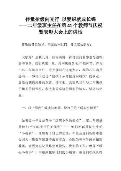 【七哥公文】2025年:伴童拾级向光行 以爱织就成长锦 ——二年级班主任在第41个教师节庆祝暨表彰大会上的讲话+更多免费公文+VX:QiGeGongWen2024