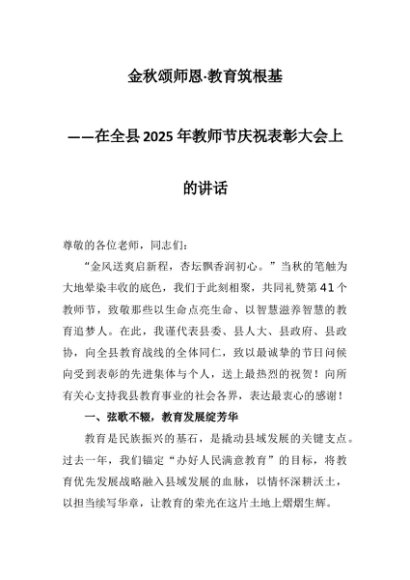 【七哥公文】2025年:在全县2025年教师节庆祝表彰大会上的讲话:金秋颂师恩·教育筑根基+更多免费公文+VX:QiGeGongWen2024