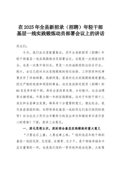 【七哥公文】2025年:在2025年全县新招录(招聘)年轻干部基层一线实践锻炼动员部署会议上的讲话+更多免费公文+VX:QiGeGongWen2024