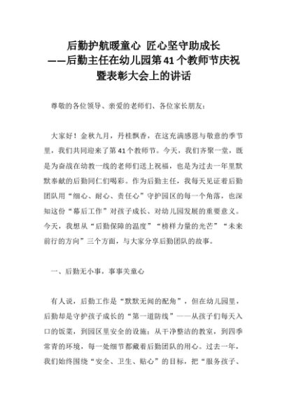 【七哥公文】2025年:后勤护航暖童心 匠心坚守助成长 ——后勤主任在幼儿园第41个教师节庆祝暨表彰大会上的讲话+更多免费公文+VX:QiGeGongWen2024