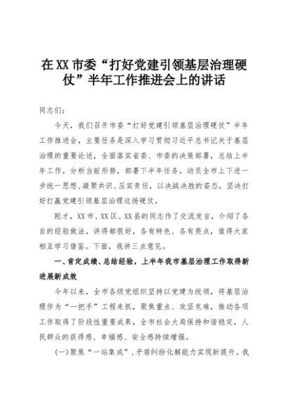 【七哥公文】2025年:在XX市委“打好党建引领基层治理硬仗”半年工作推进会上的讲话+更多免费公文+VX:QiGeGongWen2024