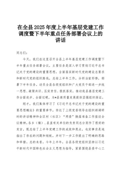 【七哥公文】2025年:在全县2025年度上半年基层党建工作调度暨下半年重点任务部署会议上的讲话+更多免费公文+VX:QiGeGongWen2024